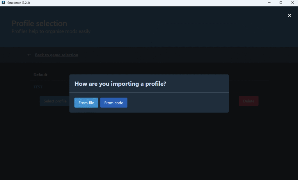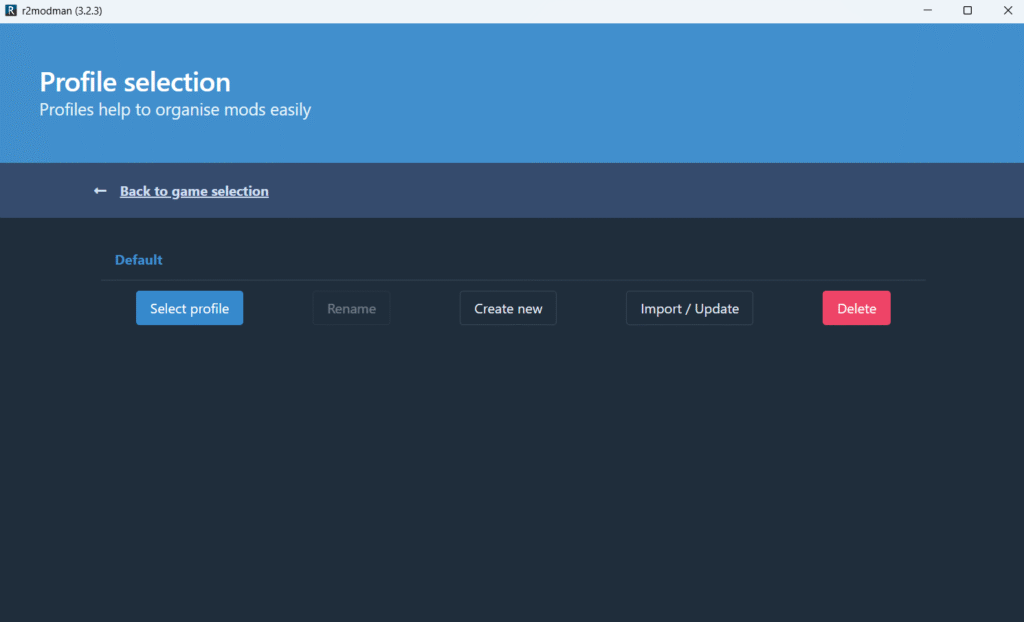 - First, open R2ModMan and select the same game for which the modpack was created.